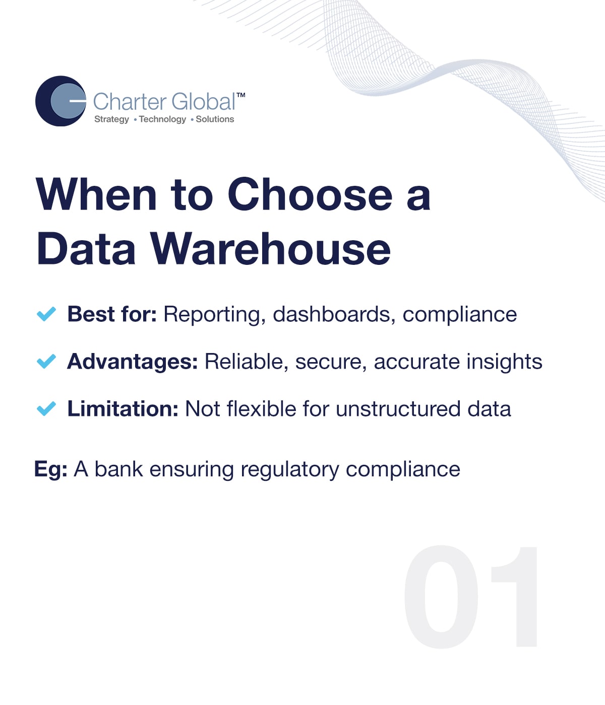 Go with a Data Warehouse if: Accuracy, compliance, and structured reporting are your top priorities.