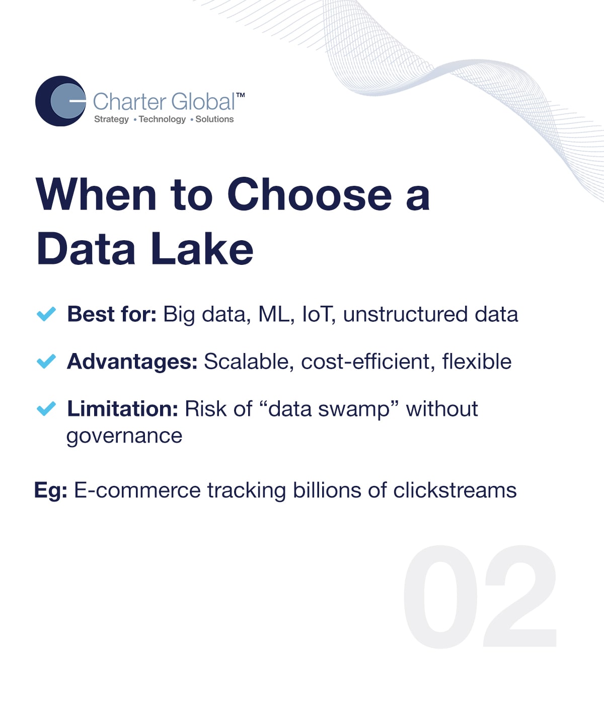 Go with a Data Lake if: You want to store massive, diverse datasets and experiment with ML or big data analytics.