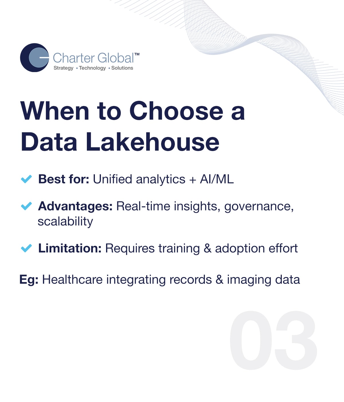 Go with a Data Lakehouse if: You are looking for a long-term, unified architecture that can handle both traditional BI and modern AI use cases without maintaining multiple systems.
